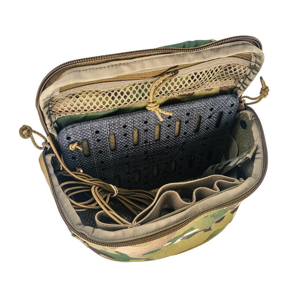 The Answer: The Cobra Mini Medical Pack takes the fanny pack to a new level of access and organization. It carries the features as our previous fanny packs – waste belt, satchel carry and MOLLE vest attachment and side drag handle. And by extending the top zipper around the side and bottom forming the Cobra shape, we allowed access to the bottom as well as the ability to splay the entire pouch open flat for easy visibility and access to all pouches. Now we can access additional pockets in the bottom of the pouch. Interior is lined with loop Velcro and includes an elastic loop tray and SOTech OrgBoard elastic loop tray. Can also affix to MOLLE with MOLLE Stix for quick removal. Includes belt that can be affixed to side buckles or as a shoulder sling strap