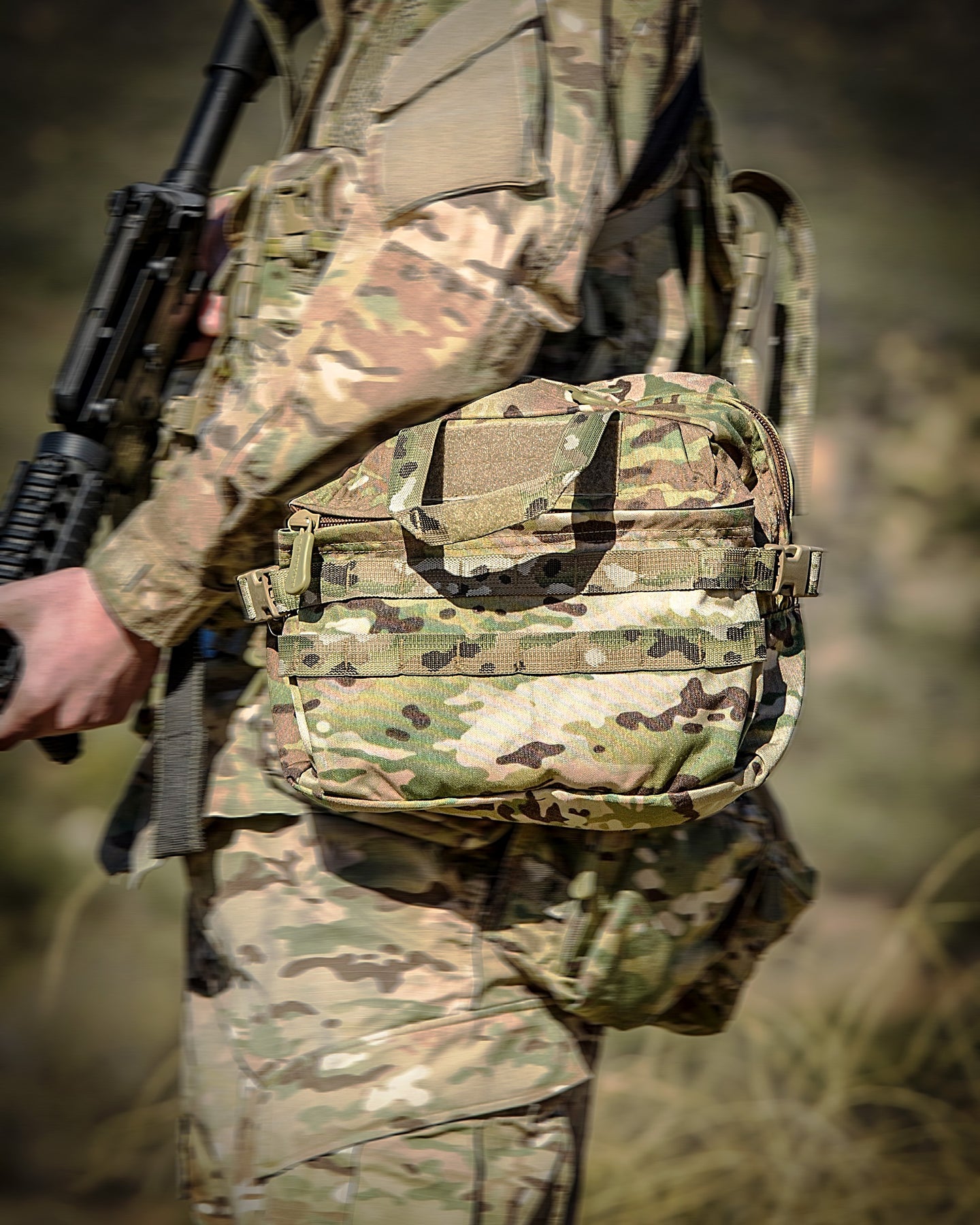 The Answer / Description: Designed as a satchel go bag that is contoured to hug the body and can be worn as a shoulder bag, waist pack, fanny pack, briefcase, ruck lid, vest pouch or vehicle bag. The S.O.TECH Mission Go Bag fulfills multiple mission requirements. It can be easily configured as a shoulder bag, and with a fold and a snap, it converts into a waist/fanny pack that rides below body armor. Stowing the shoulder straps in the rear pocket configures the bag as a briefcase utilizing stow-able carrying handles or as a large vest pouch for front or back wear using the PALS/MOLLE compatible Flex-Tab™ attachment system (U.S. Patented). These tabs can also secure the bag to a larger pack. A contoured shoulder strap, padded back plate and sleek design with rounded edges provide comfort required for long missions. Thick shoulder strap, reinforced attachment points and large buckles provide durability required in modern combat environments, while economic use of high-tech materials minimizes the bag weight as part of the soldier’s load. Logically placed and enlarged buckles and zipper pulls provide ease of operation in stressful operations and poor weather.