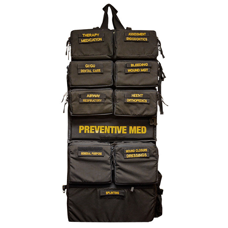 TACTICAL MEDICAL MODULAR CARRIAGE SYSTEM - GEN II is a modular medical pack system that functions across the 3 platforms of RUCK-TRUCK-HOUSE. This 2nd generation evolution of SOF medical packs incorporates a decade of wartime operator input. The result is a tailored set of modular pouches that are chosen to affix to any of these packs, harnesses, and panels. The system also supports a supply tree with the top being the box (MMCIS) which supplies/supports the hanging panel (RAMMP), and that in turn supports the large pack (MMP-L) which supports the medium pack (MMP-M) which supports the (MMP-S). The packs integrate and share the load with the medical belt/harness system (MACBS). The insert organizers and belt, pack and panel pouches fully integrate and can mount on any platform within this system. And finally, the IFAK (RFAP) is the base of the system mounting basic first aid items on all personnel on the team. This system follows the wounded soldier from the point of traumatic injury all the way through transport to the hospital.