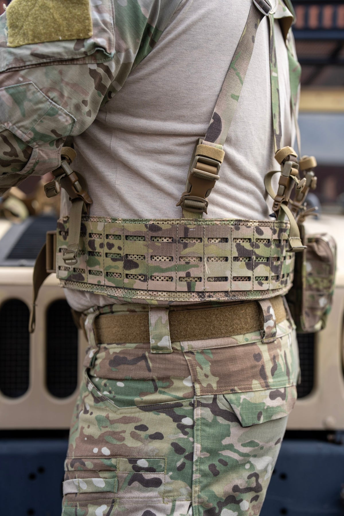 Introducing the S.O.Tech 3 Row Jungle Belt. The belt is composed of spacer mesh for aeration and a sewn in hidden Tegris stiffener, with 6 tabs for a 6pt H-Harness. It comes 2 inch webbing and 2 inch side lock buckles (removable) with quick cinch adjusters to spread the belt when prone. The plastic belt can be removed and replaced through the slot using a riggers belt or cobra buckle belt.